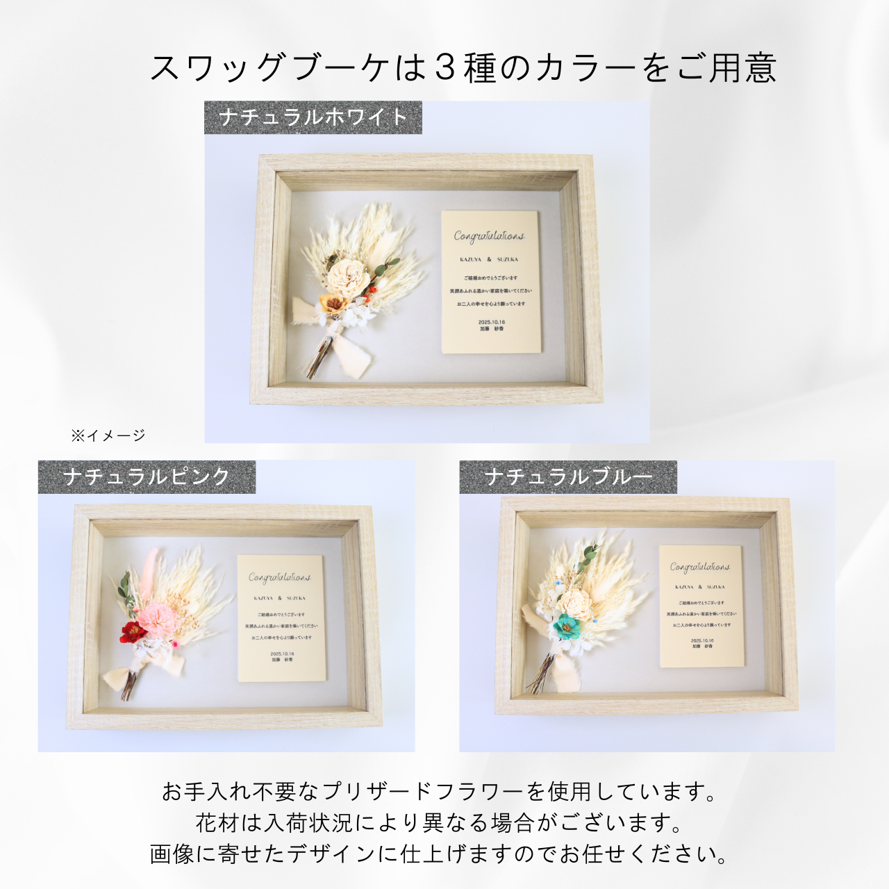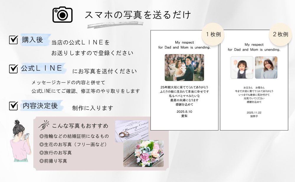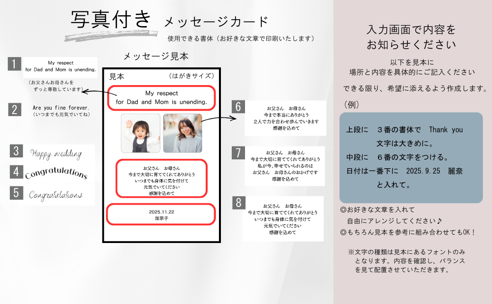 お好きな内容でメッセージカードをお作りします。以下は一例なので、オリジナルの内容や組み合わせでご自由にアレンジください。