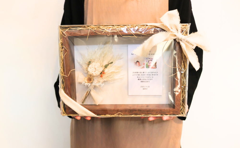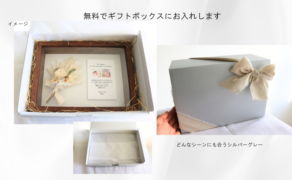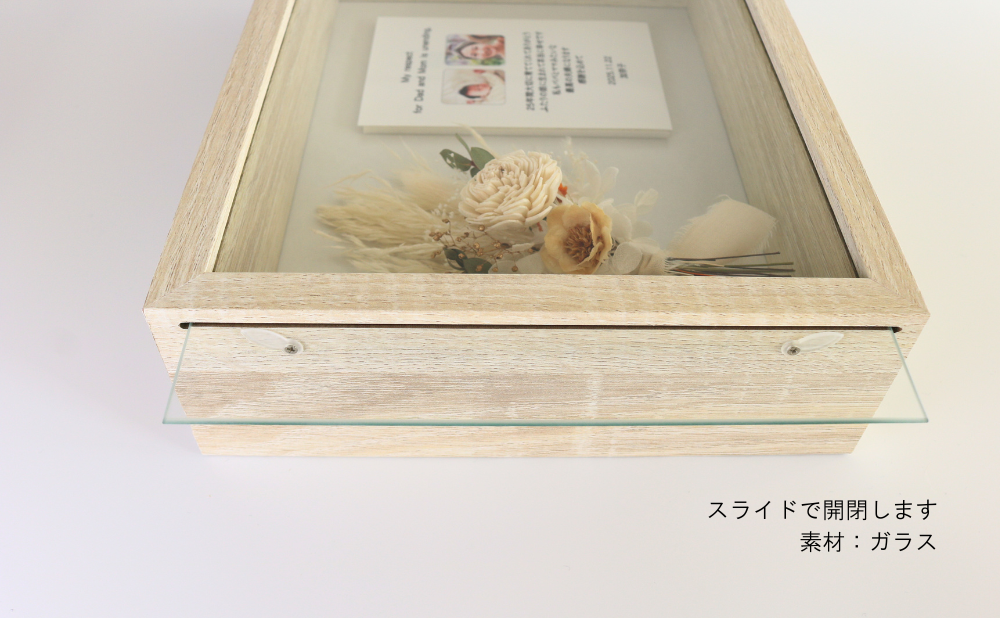 お好きなメッセージを添えて贈る小さなボックス。ガラス面の文字がより一層ブーケを引立てます。