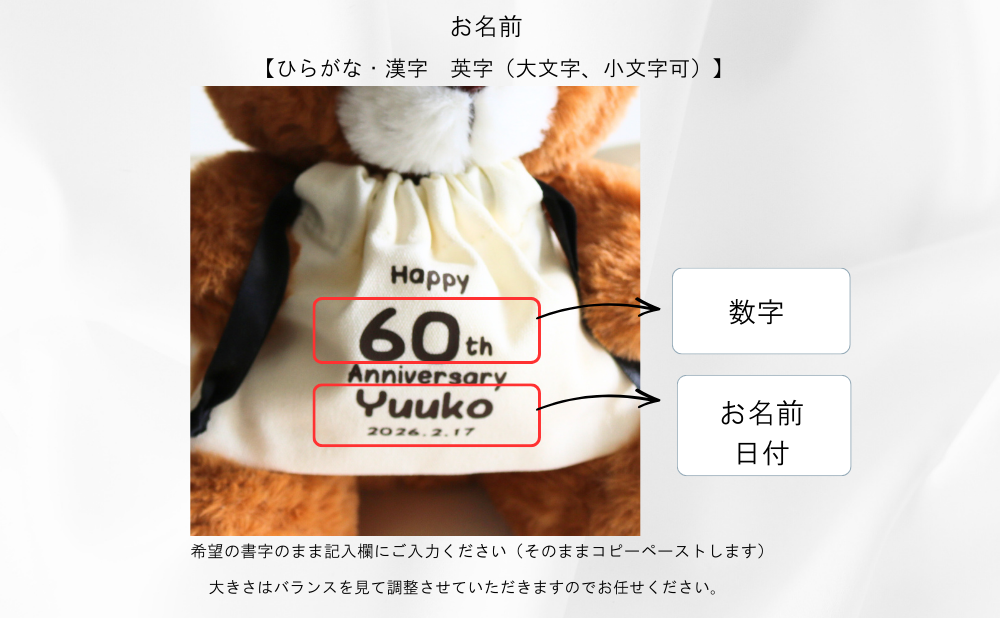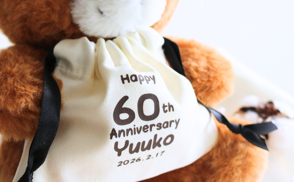 ◎巾着袋にお名前・周年・日付が入ります