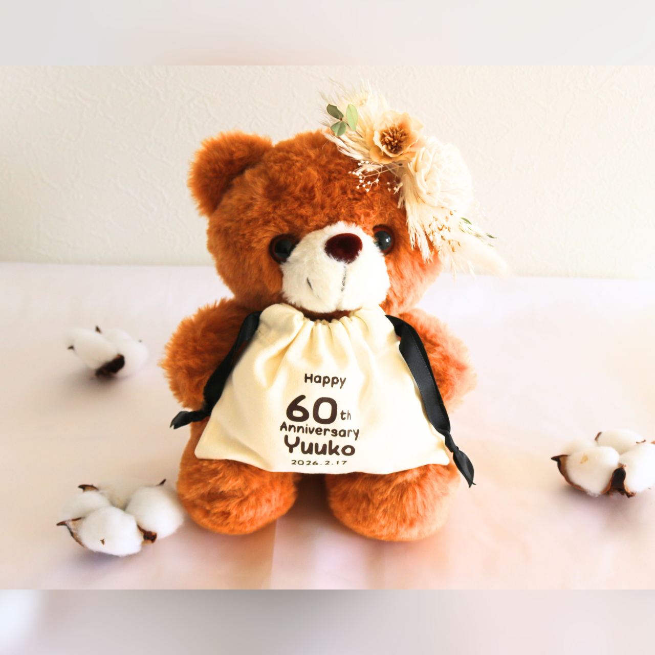巾着袋は取り外しもできるから、日常で使うことができます。ポーチとしてコスメ入れにもできるから便利。ベアーには、お手入れ不要なスワッグブーケが付いているから、おしゃれなインテリアアイテムになります。