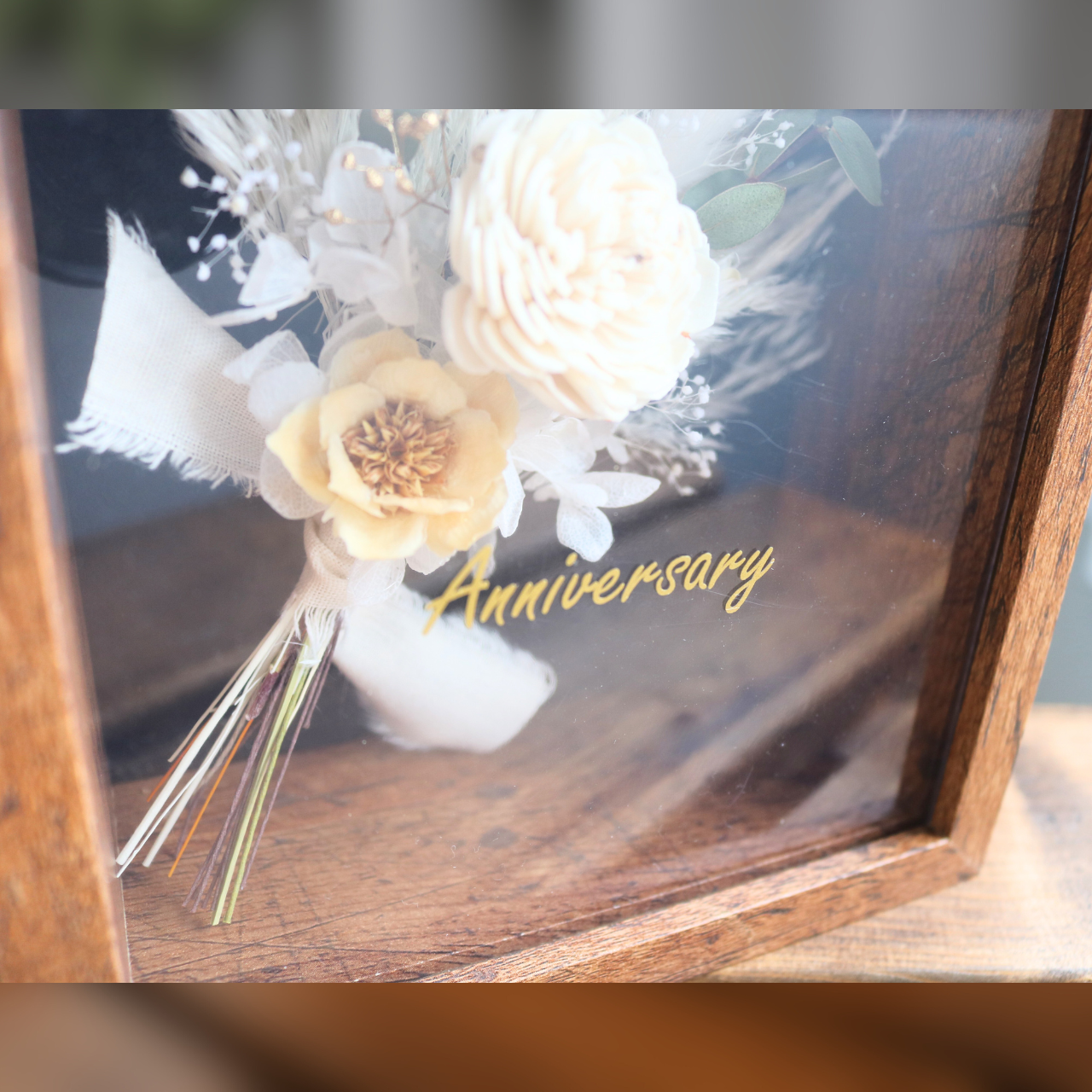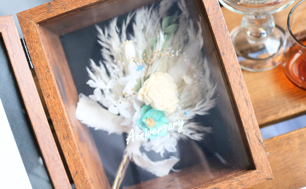 お好きなメッセージを添えて贈る小さなボックス。ガラス面の文字がより一層ブーケを引立てます。