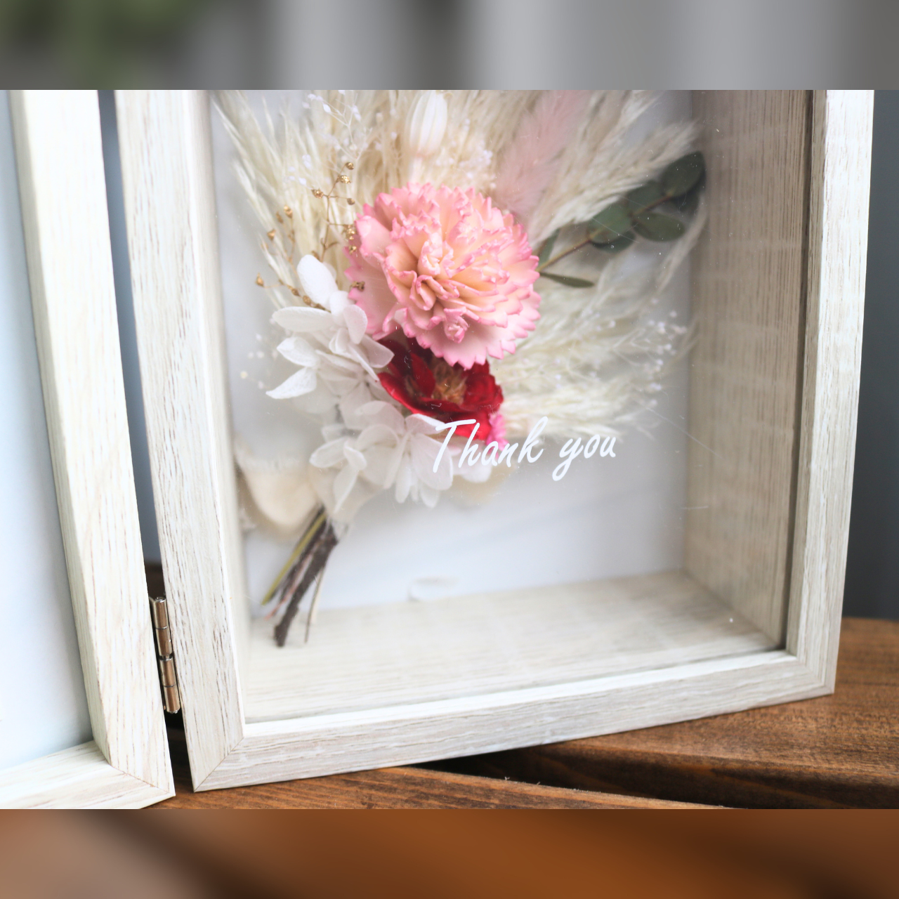 お好きなメッセージを添えて贈る小さなボックス。ガラス面の文字がより一層ブーケを引立てます。