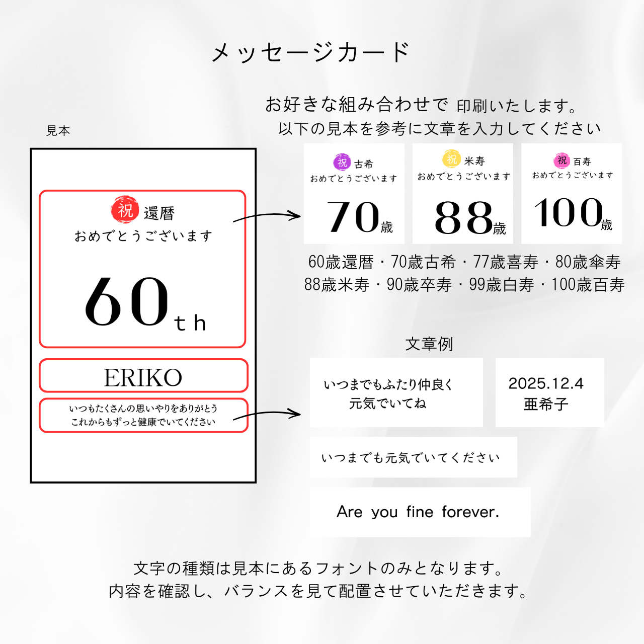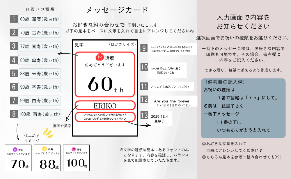お好きな内容でメッセージカードをお作りします。以下は一例なので、オリジナルの内容や組み合わせでご自由にアレンジください。