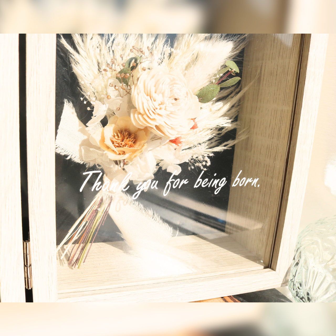 お好きなメッセージを添えて贈る小さなボックス。ガラス面の文字がより一層ブーケを引立てます。