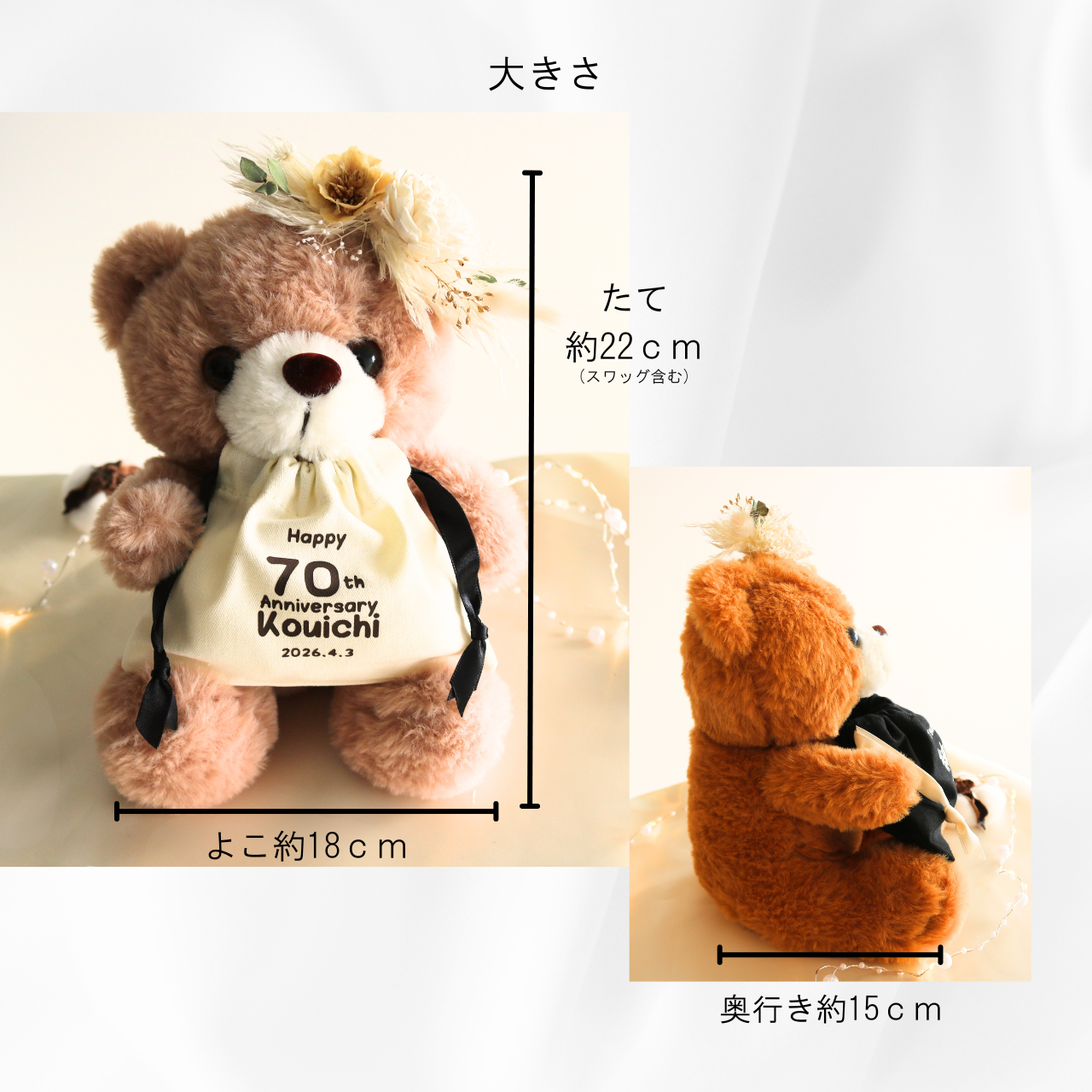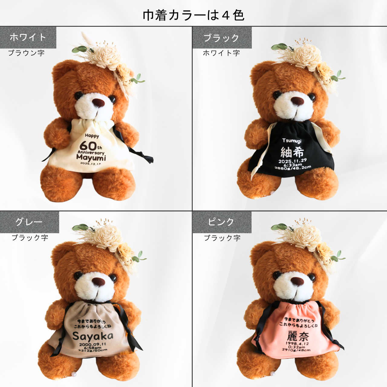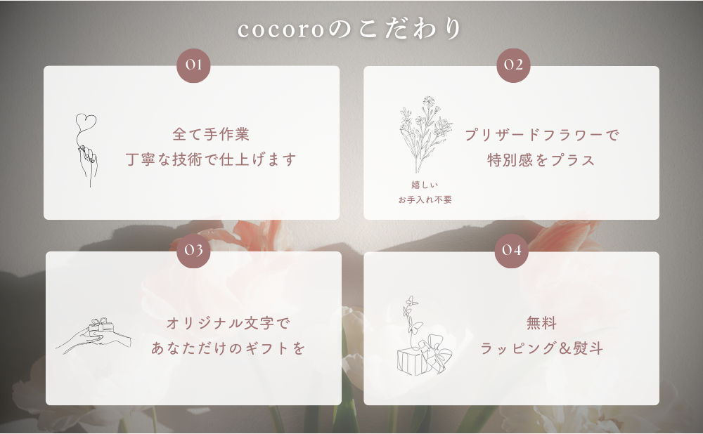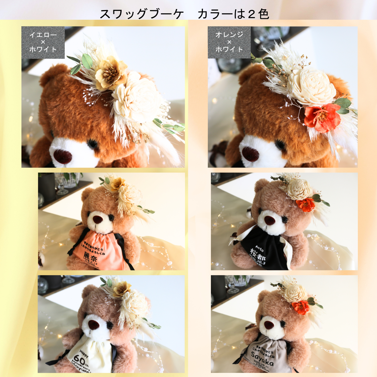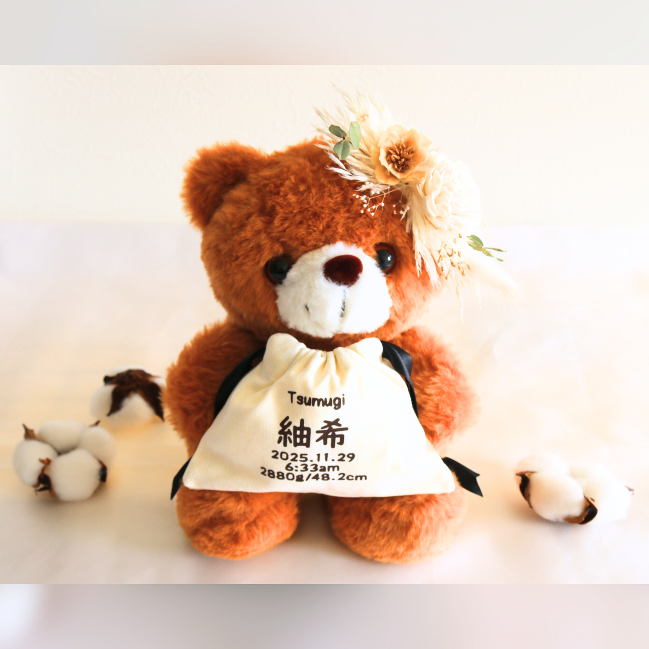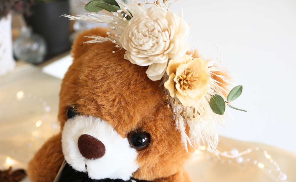 一点一点手作業で仕上げています。プリザードフラワーは花材の状況により種類が異なる場合がありますが、画像に寄せたデザインで製作いたしますので予めご了承ください。また、ベアーにも若干の個体差がありますことご理解の上お買い求めくださいませ。