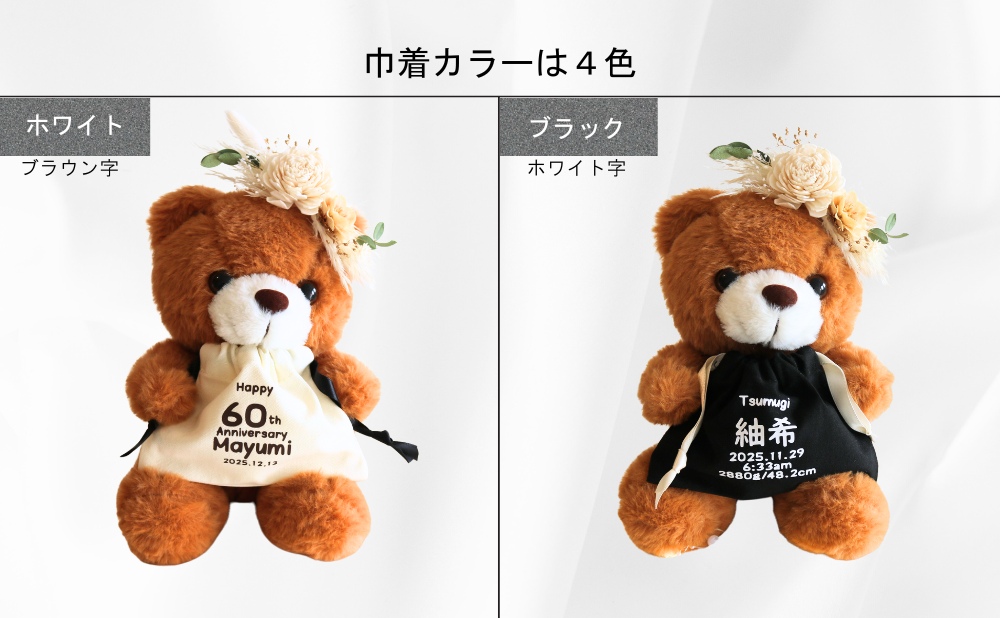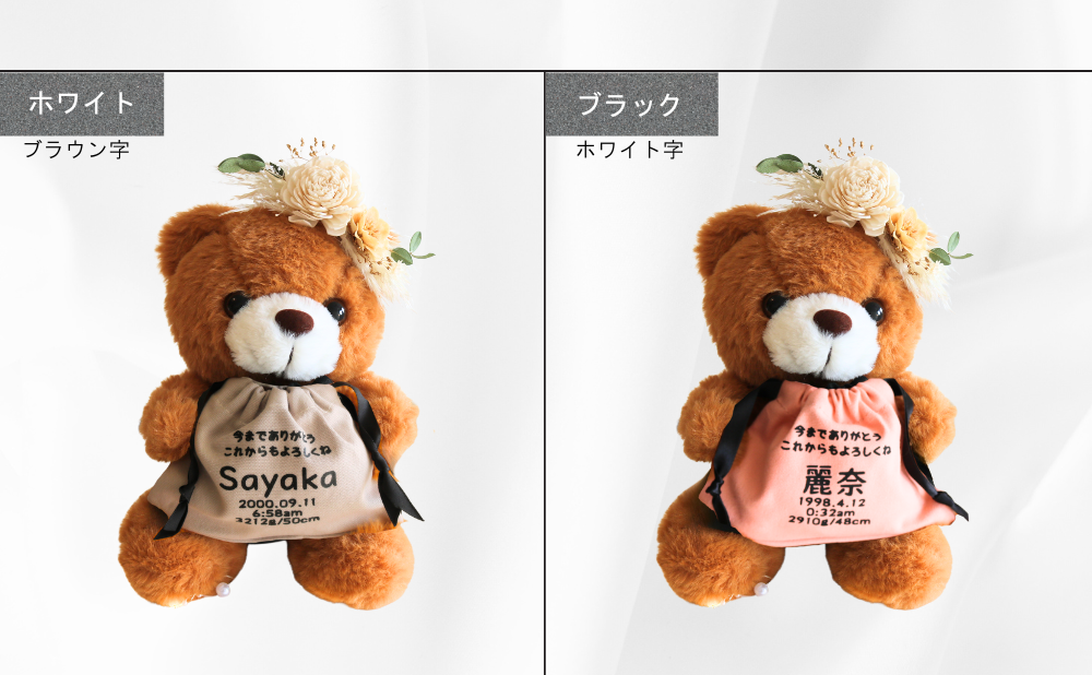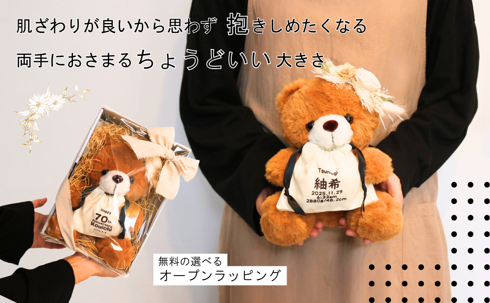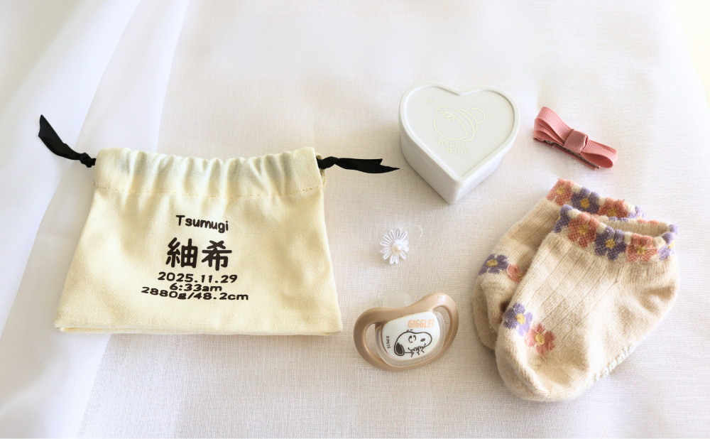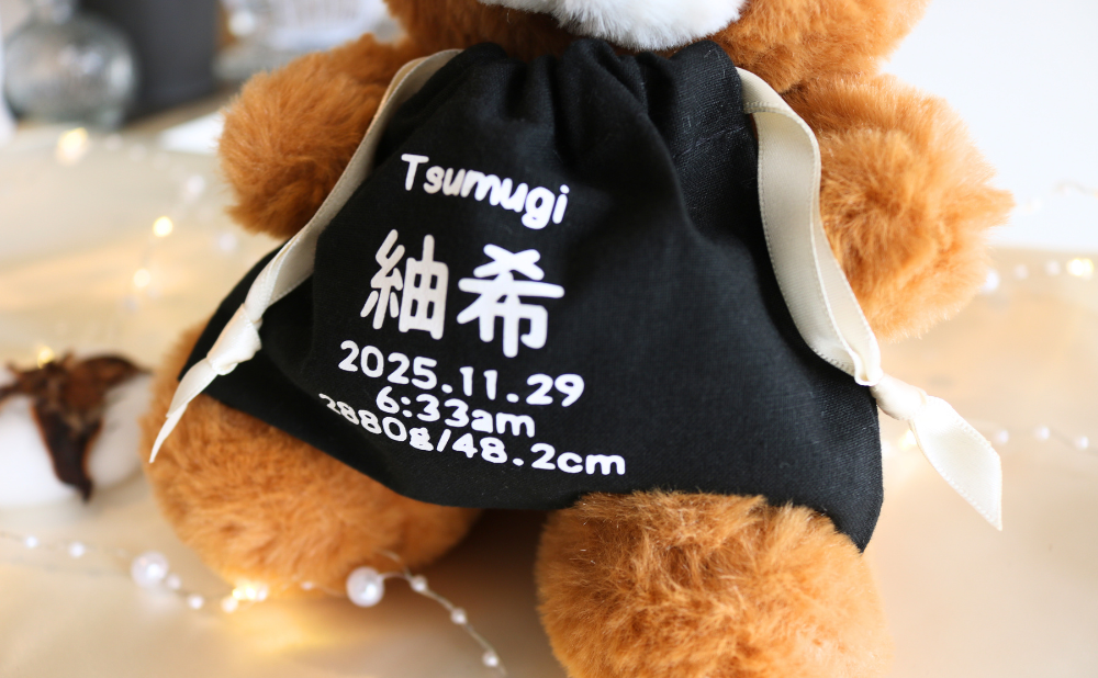 当店限定のメモリアルベアーは、単なる収納ではなく、家族の歴史や愛情を形にして残す大切なアイテムです。赤ちゃんの時期はあっという間に過ぎてしまいます。巾着袋に赤ちゃん用品をまとめておくことで、成長の過程や家族の思い出を形として残せます。かけがえのない思い出をいつでも振り返ることができ、家族の絆を深めるきっかけにもなります。